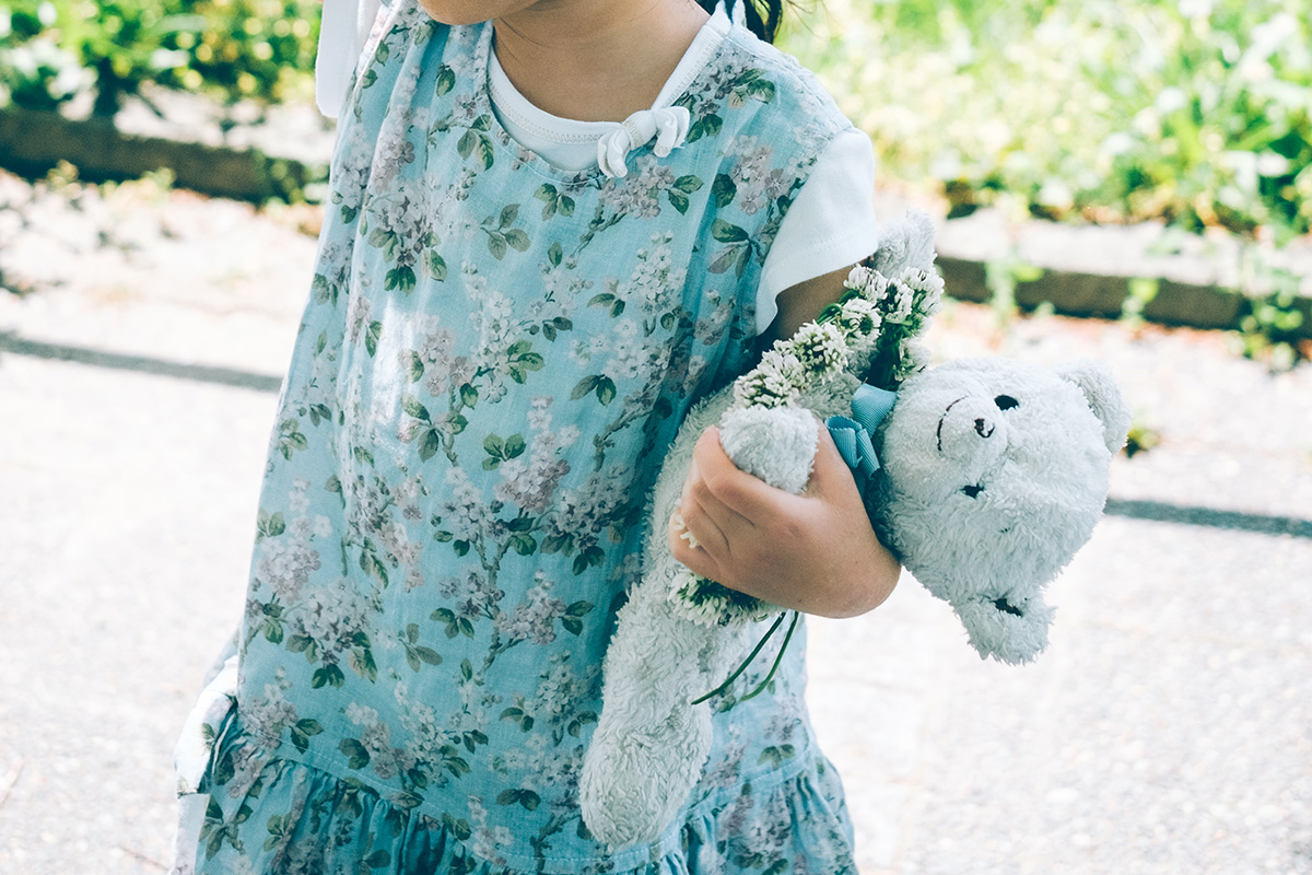 結婚した20年前、妻と一緒に新居にやってきた”連れ子”です。名前は『しろ』、2才の男の子。娘が生まれる前の10年間、2人でしろに話しかけて、しろからも返事があって(※しろの声優はぼくか妻)、毎日会話していました。健康面や経済面などに悩み、2人で話し合っていて行き詰まったとき。しろにそれを語りかけると、それまで思いつかなかった前向きな言葉が返ってきて何度も何度も勇気づけられました(※繰り返しますが、しろの声優はぼくか妻)。娘が生まれてからは、娘もしろが大好きになって肌身離さず連れ歩き、「しろちゃん、しろちゃん」と呼んでドレスを着せて一緒に成長しました(※いつのまにか女の子に)。今や鼻の頭がちょっと禿げ、身体の芯もくたくたなのは、愛され続けてきた証。変わらない笑顔でこれからも家に居てほしい……と、44才のおっさんが思っています。