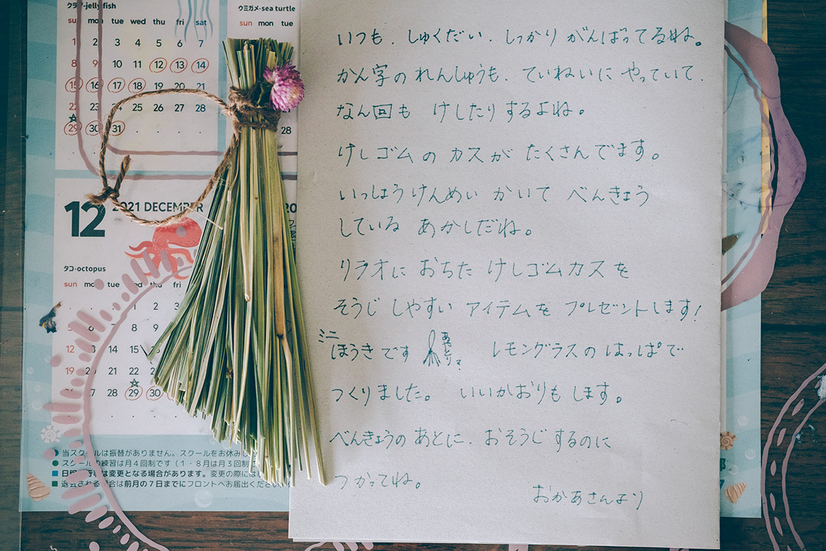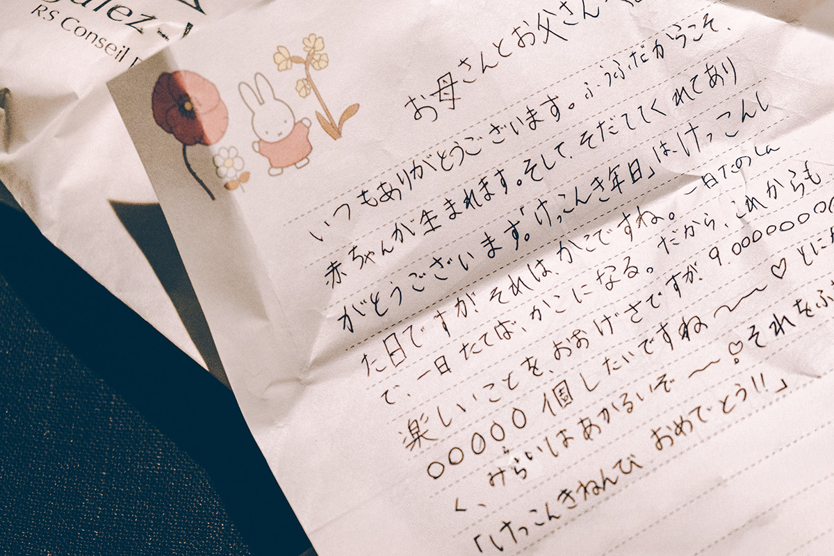 一つめの写真は何年か前に妻から当時7才の娘に宛てた、書き置き。”リラオ”というのは娘が宿題に使っていたテーブルのあだ名。ぼくがある日なにげなくリラオを見ると、置いてあったんです。まだ慣れていない小学生生活、いつもこのテーブルで頑張っている娘と、それを温かく見守る妻の心を感じて、いい手紙だなぁと思います。もう一枚は、8才のときの娘が結婚記念日にくれた手紙。この結婚があったから自分という子が生まれた、という巡り合わせに子ども心なりの思いを馳せ、時間の戻らなさを受け止め、楽しい時間を過ごしたいと願い、明るい未来を親に伝えてくれること……。小さな身体で、純粋無垢な笑顔で、なぜそんな過去や未来に思いを馳せることができるのか、親の未来を願うことなんてできるのか。うれしくて、ありがたくて、今でも驚きをもって読み返す手紙です。