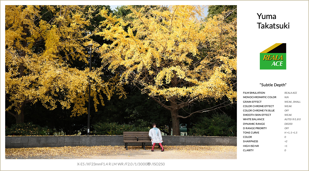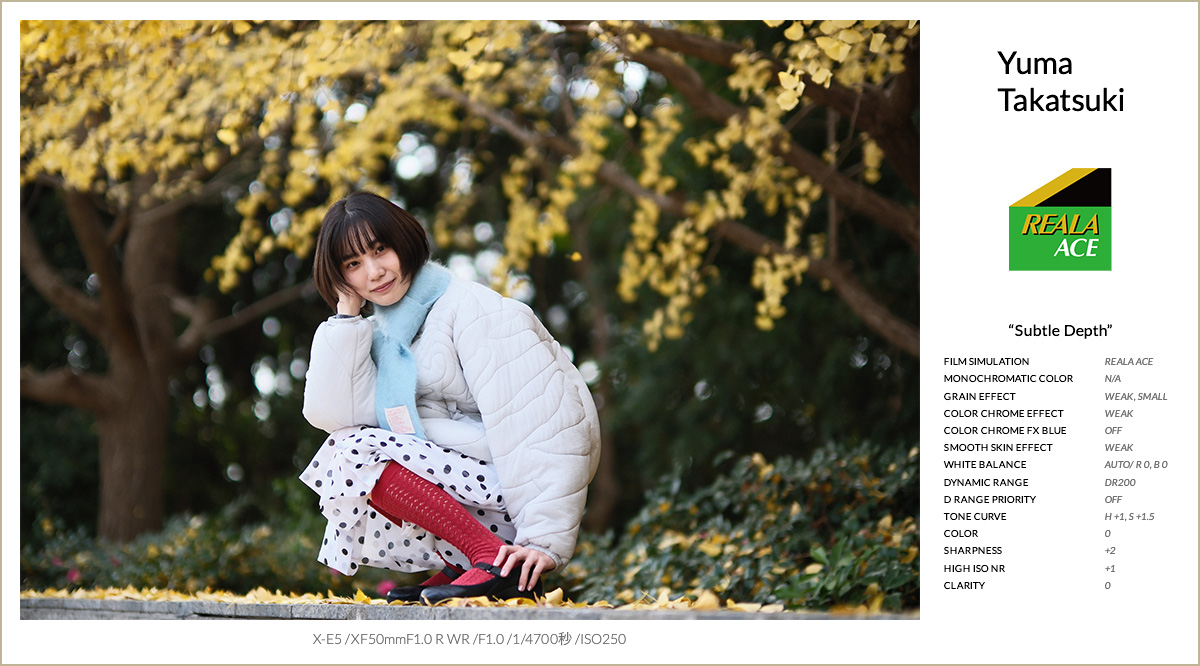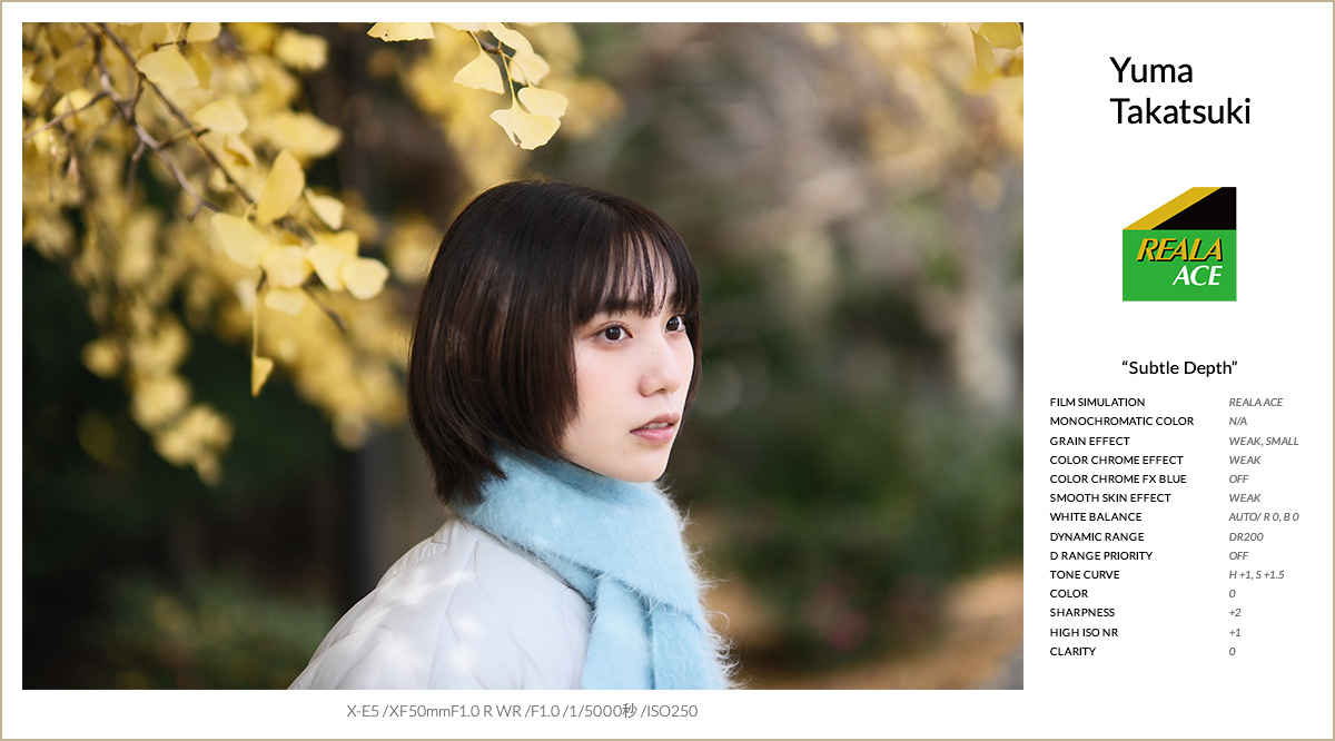 FSレシピ①は、フィルムシミュレーションにREALA ACEを採用し、忠実な色再現と立体感のある階調表現をベースに組んだレシピです。REALA ACEの落ち着いた彩度をベースに、カラークローム・エフェクトを弱で重ね、色の深みと階調の美しさを自然に引き出しています。グレイン・エフェクトはWEAK/SMALLに設定し、デジタル感を抑えつつ質感をプラスしています。スムーススキン・エフェクトは弱に留め、撮って出しでも肌が不自然にならないツヤ感を意識しました。トーンカーブでコントラストを少し調整し、シャープネスとノイズリダクションで輪郭と解像感を整えた、汎用性の高い仕上がりになっています。