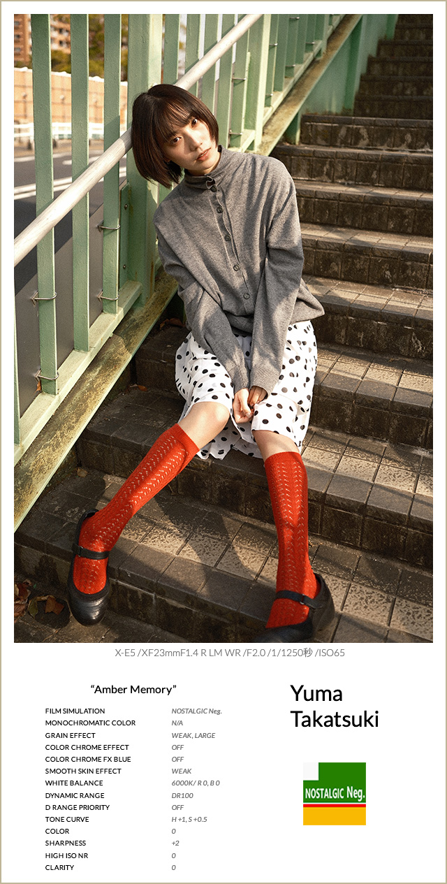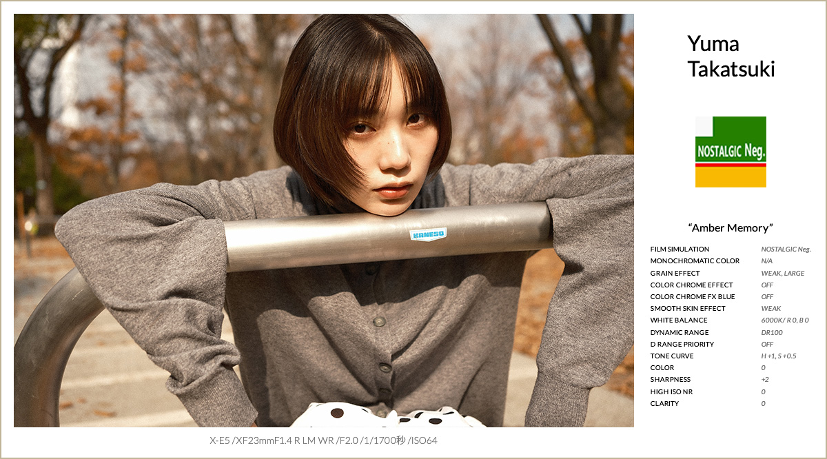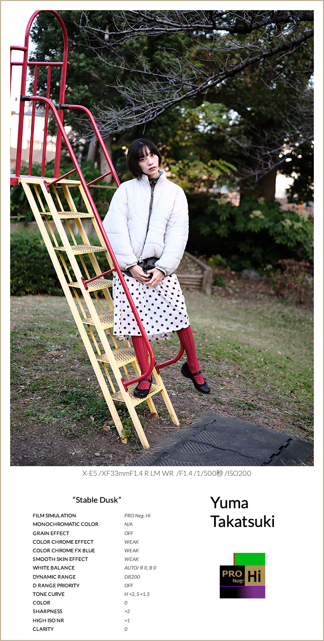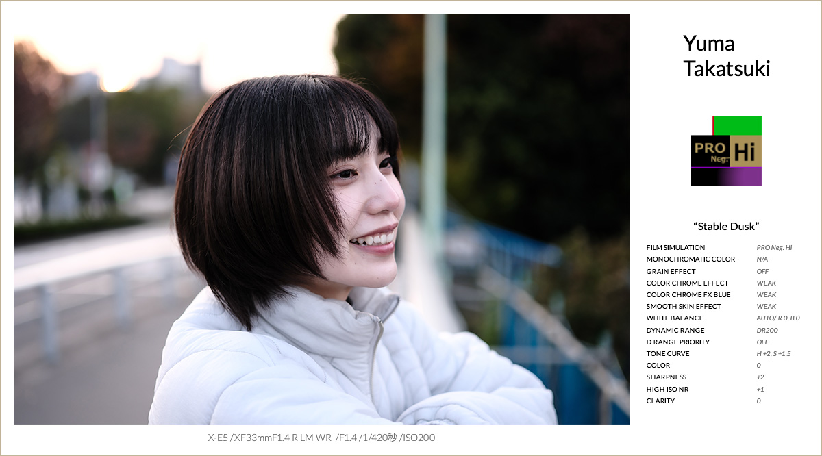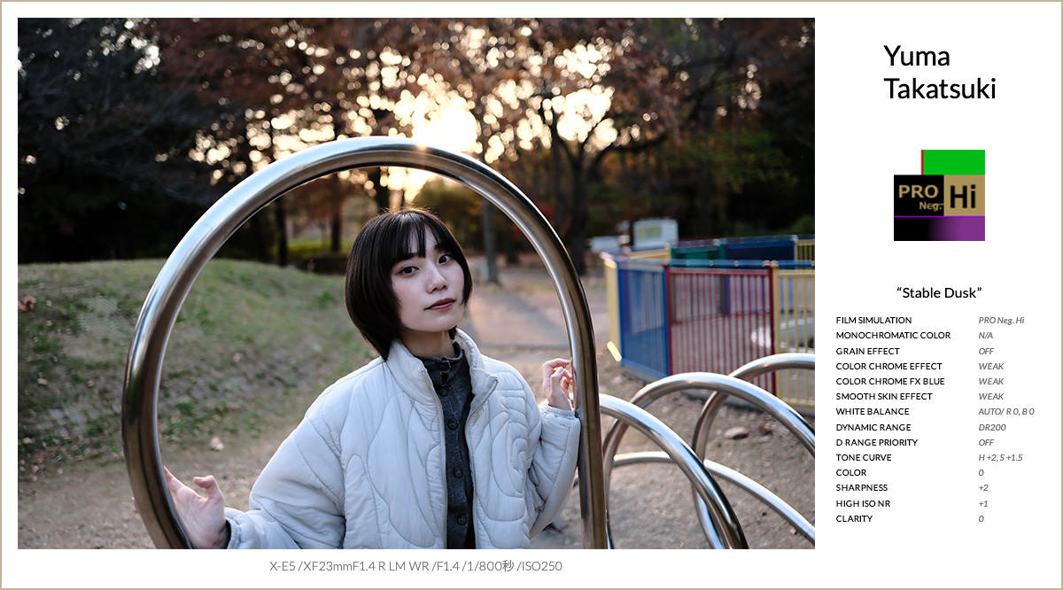 FSレシピ②は、ポートレート撮影を想定して設計されたフィルムシミュレーション、PRO Neg. Hiをベースにしたレシピです。彩度を抑えつつもコントラストが高く、色の転びが少ないのが特徴で、特に肌色が安定しやすい印象です。夕方のように光量が落ち、色温度が刻々と変わる時間帯では、クラシッククロームではシャドウが沈みすぎ、肌が重く見えると感じましたが、PRO Neg. Hiは立体感を保ったまま自然に写ってくれました。今回はグレイン・エフェクトを使わず、スムーススキン・エフェクトを弱で加えることで、肌のツヤ感をそのまま活かしています。カラークローム系は弱で彩度を補い、トーンカーブでハイライトとコントラストを調整しました。夕方のポートレート撮影で、撮って出しでも安定感のある仕上がりを狙ったレシピになりました。