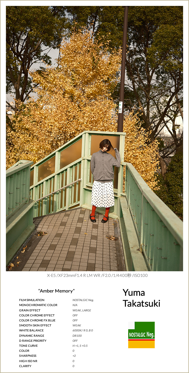 FSレシピ③は、ノスタルジックネガ特有の暖色寄りのハイライトと色の乗ったシャドウを、6000K固定でより強調した表現重視のレシピです。強い昼間の光をあえて使い、時間軸をずらすことでノスタルジックな夕暮れの雰囲気を演出しています。グレイン・エフェクトはWEAK/LARGEに設定し、粒子の存在感だけを残して印画紙のような質感を出すようにしました。DR100とカラークローム系の設定はOFFにして素のコントラストを活かし、正確さよりも空気感や記憶を優先した、飛び道具的な仕上がりとなっています。