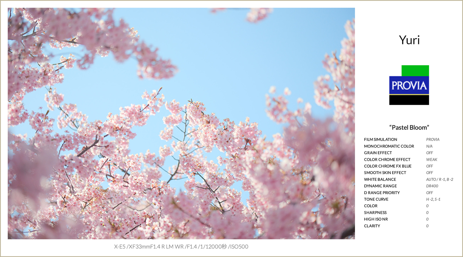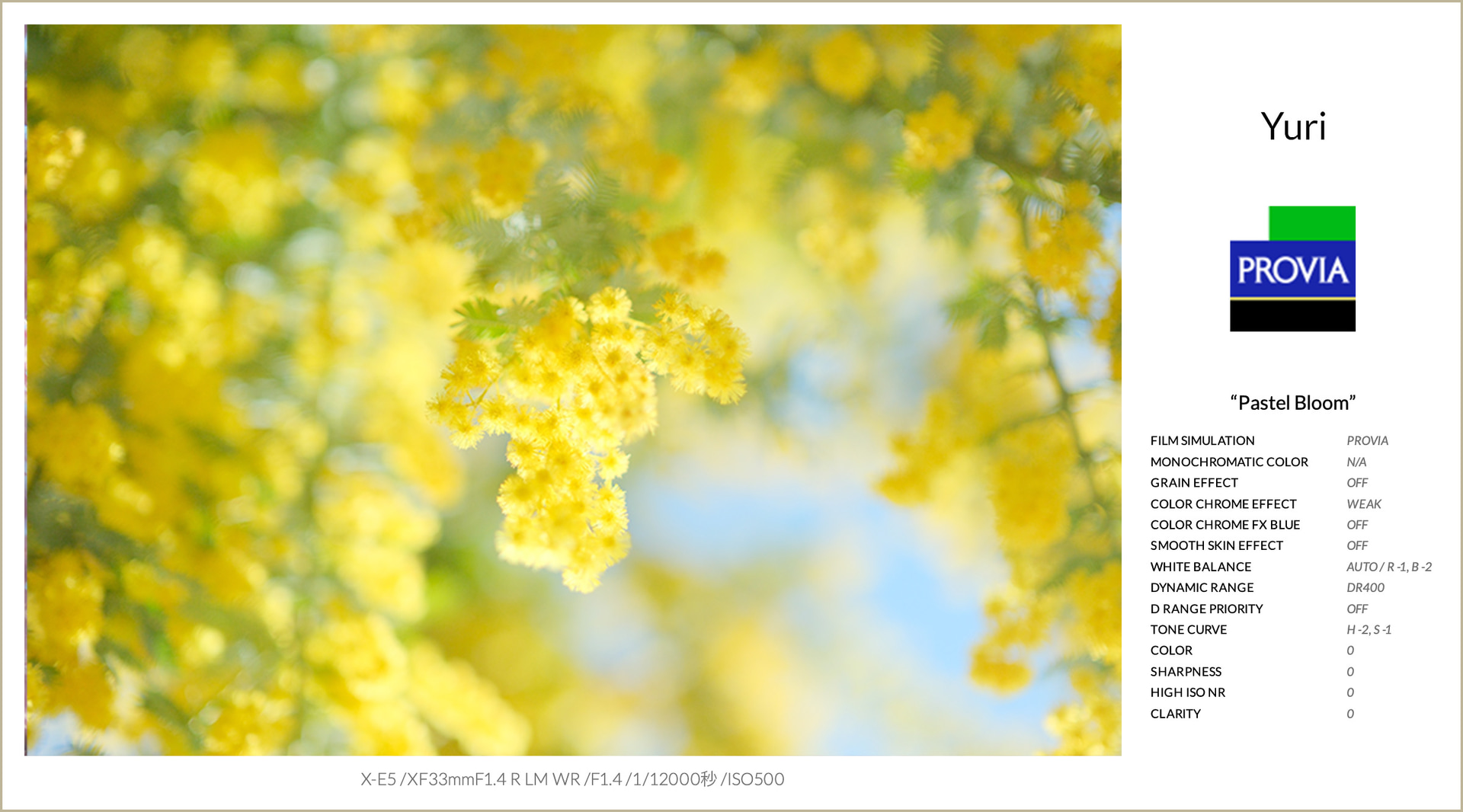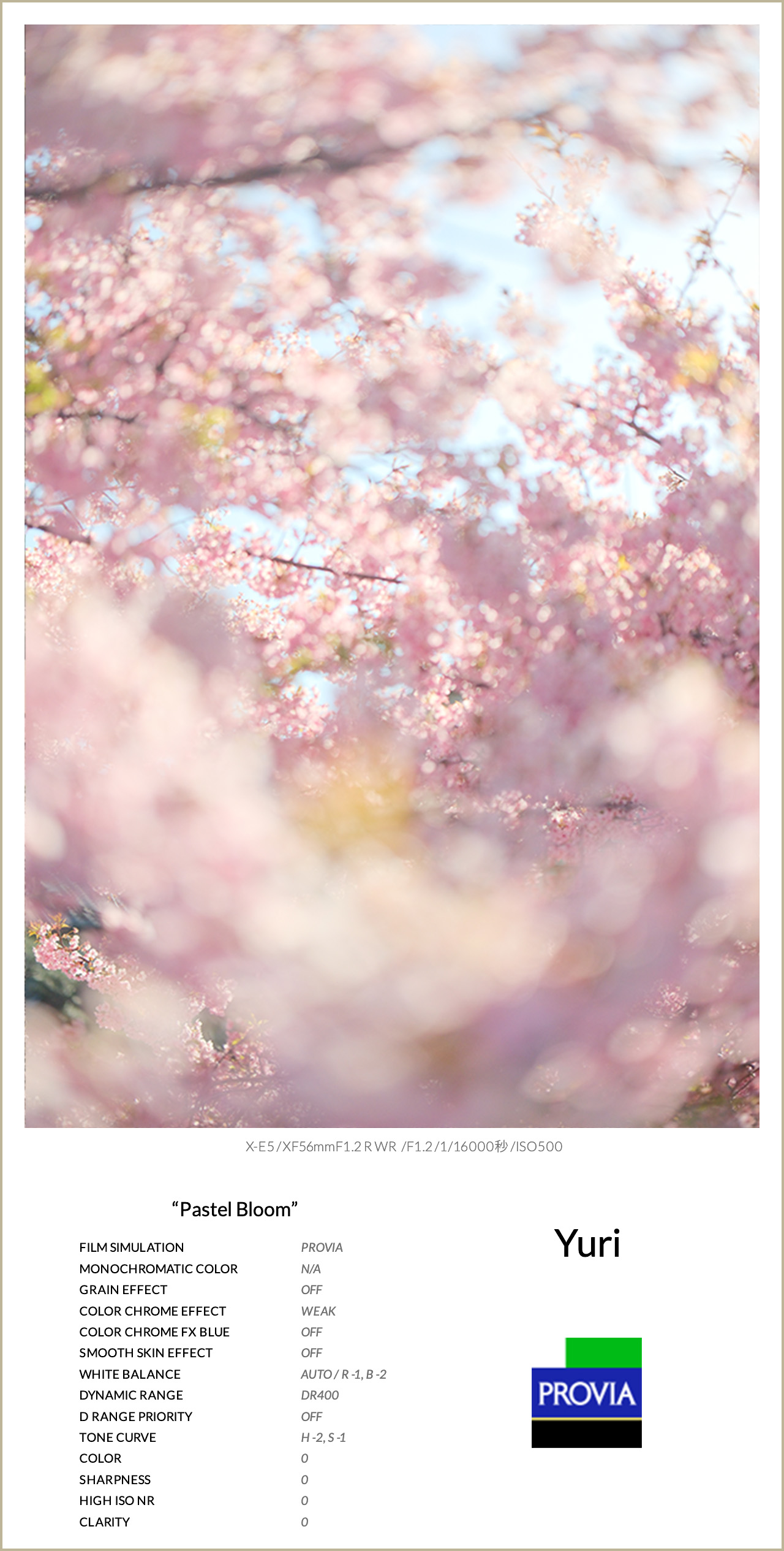 ベースとなるフィルムシミュレーションは、PROVIAを使用。自然でバランスの良い発色を活かしながら、花本来の色をそのまま美しく再現しています。そこからハイライトを抑え、シャドウを持ち上げることでコントラストをやわらげ、ふんわりとした優しい印象に整えました。