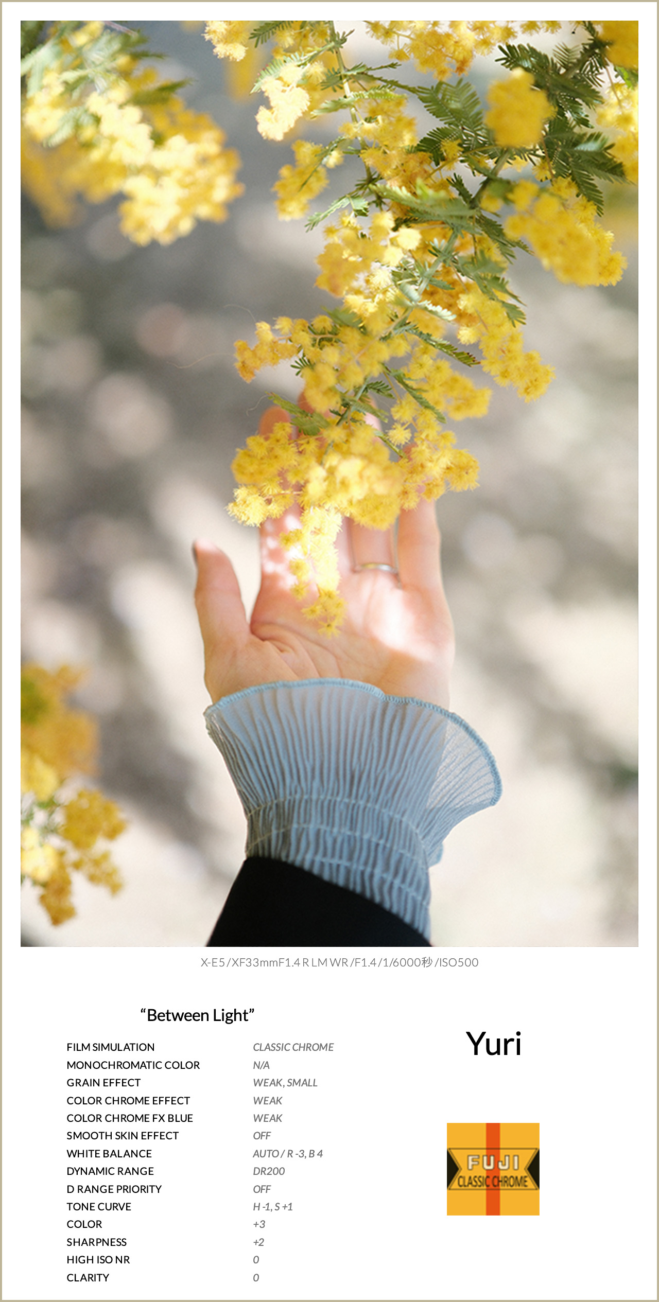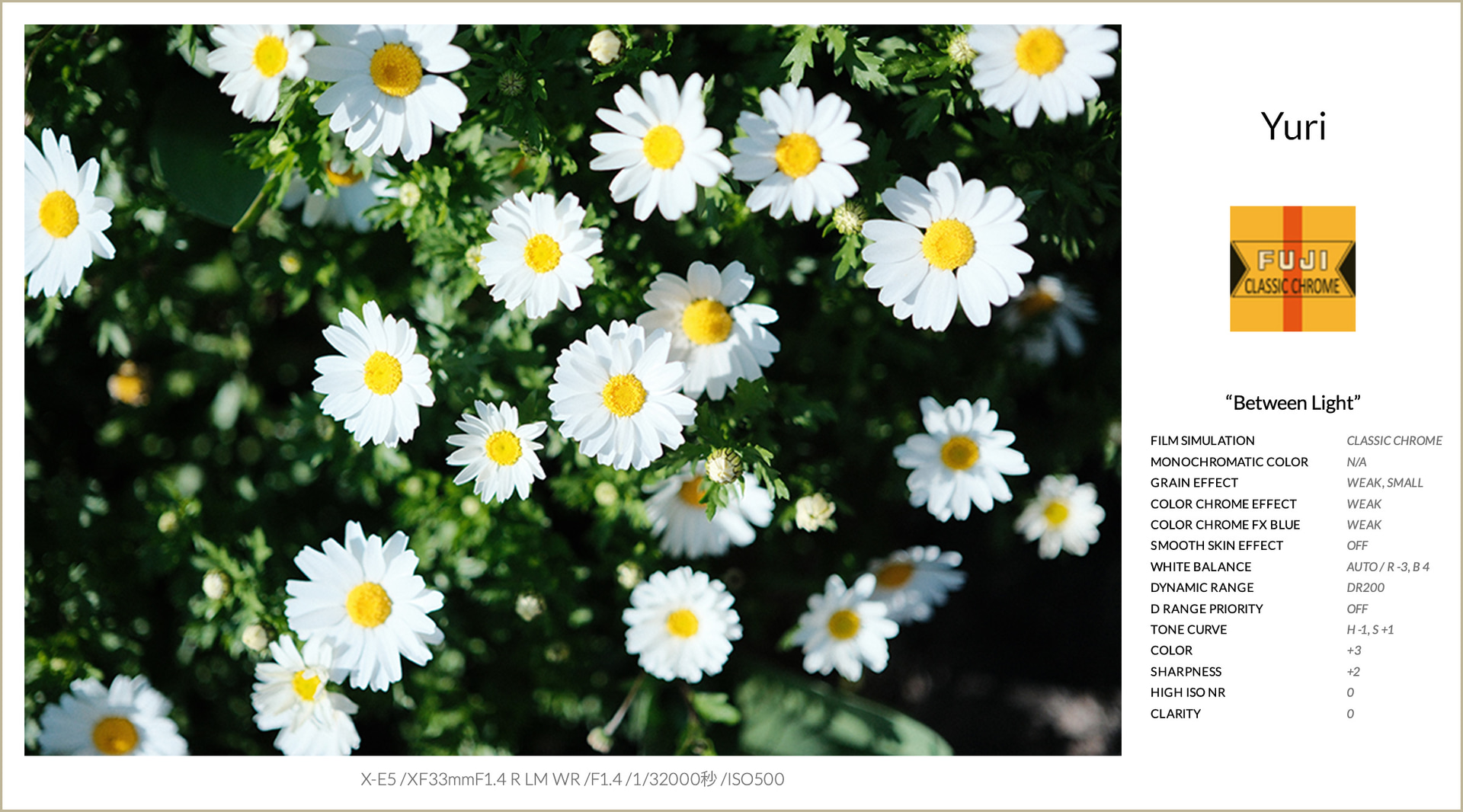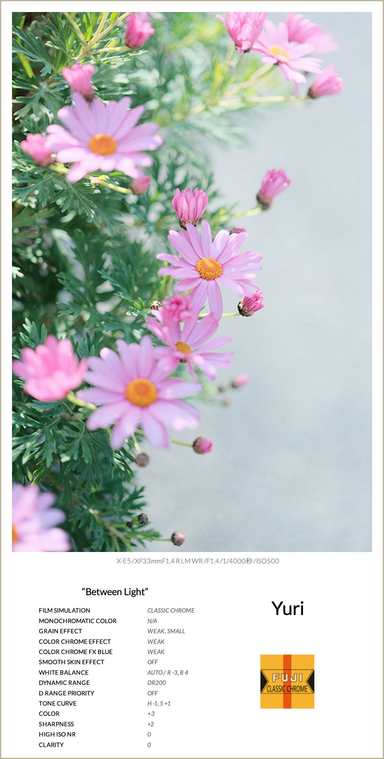 フィルムシミュレーションは、クラシッククロームを使用。落ち着いた発色とシャドウの強さを活かしながら、わずかに青みを感じるトーンで、少しクールな印象に。ハイライトを少し抑え、シャドウもわずかに引き締めることで、コントラストが強すぎず弱すぎない、自然で奥行きのある描写に整えました。ホワイトバランスはブルーとグリーンをプラス方向に調整し、透明感をプラス。さらにカラーを少し上げることで、お花の発色も埋もれずに表現できるようにしています。グレイン・エフェクトは弱めに加え、ほんのりとした質感を添えました。