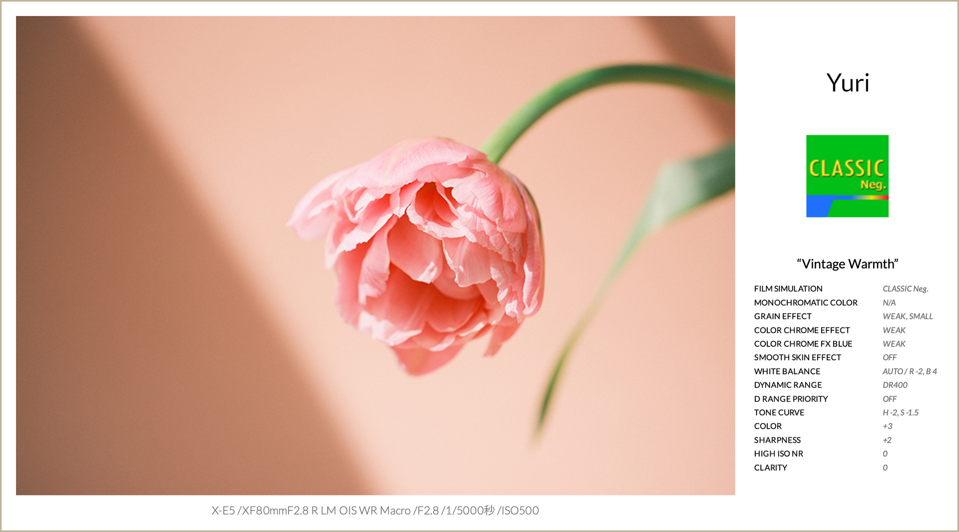 フィルムシミュレーションは、クラシックネガを使用。コントラストのある特徴を活かしつつ、シャドウを持ち上げることでクラシックネガ独特の強さをやわらげ、どこか懐かしさを感じるやさしいトーンに調整しています。