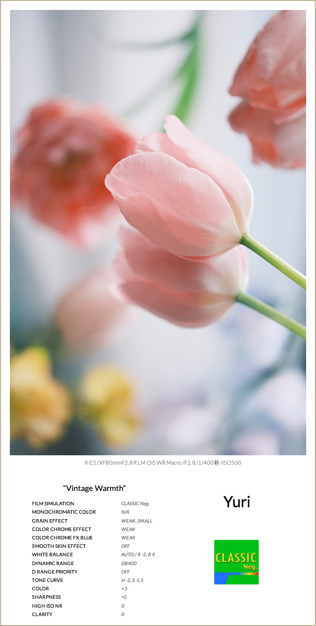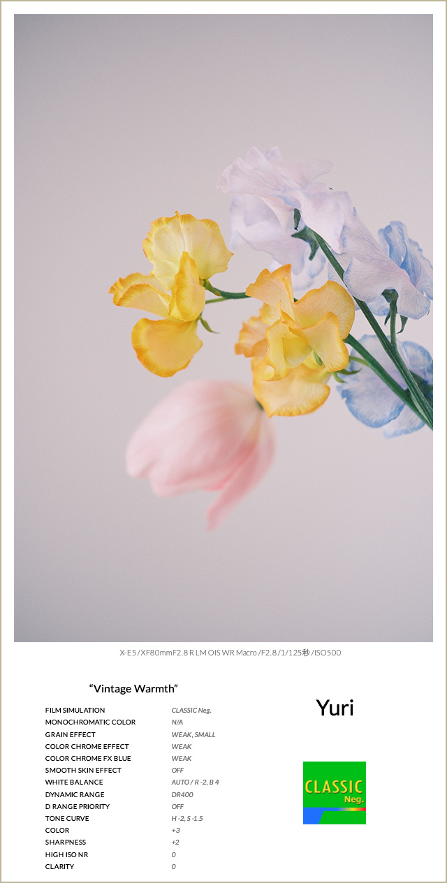 WBシフトはブルーとグリーンを少しプラスし、色のバランスを整えながら自然なトーンに。グレイン・エフェクトを加えることで、ほんのりとしたレトロな質感をプラスしています。彩度も控えめなベースに対して少し上げることで、お花の色がやさしく引き立つよう工夫しています。
