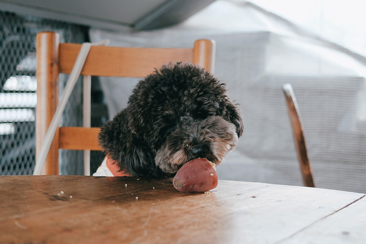外の席はワンコもOKなので一緒に。スタッフからお芋をもらって食べていました。