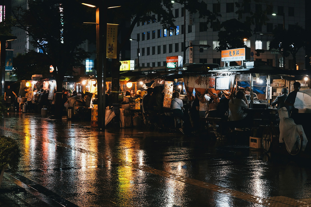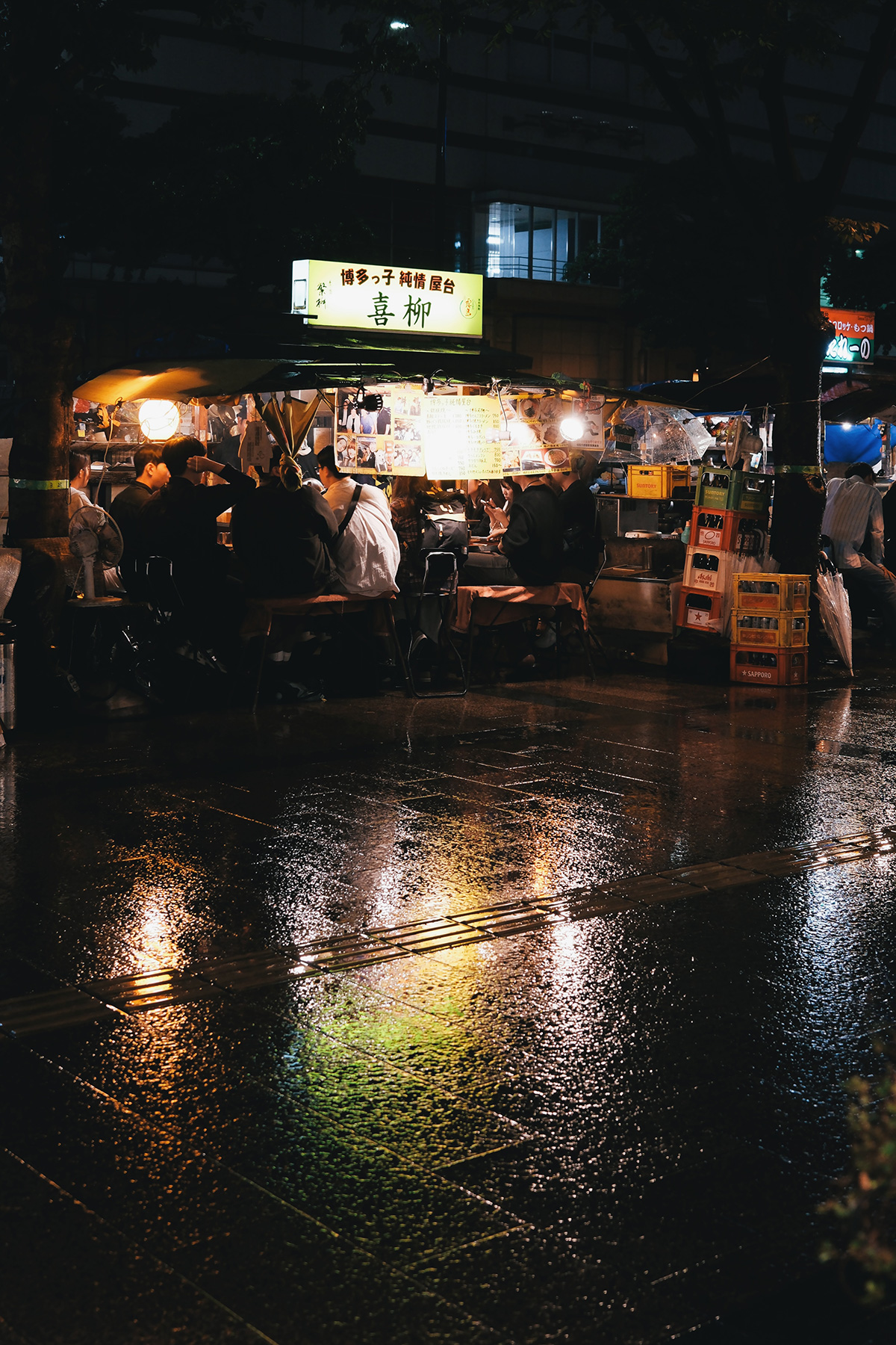 福岡に住んでいても、意外にも屋台に行く機会はあまりありません。少し雨が降ったから、道に反射する屋台の光がとてもキレイ。いい感じに屋台の並びが撮れて満足。