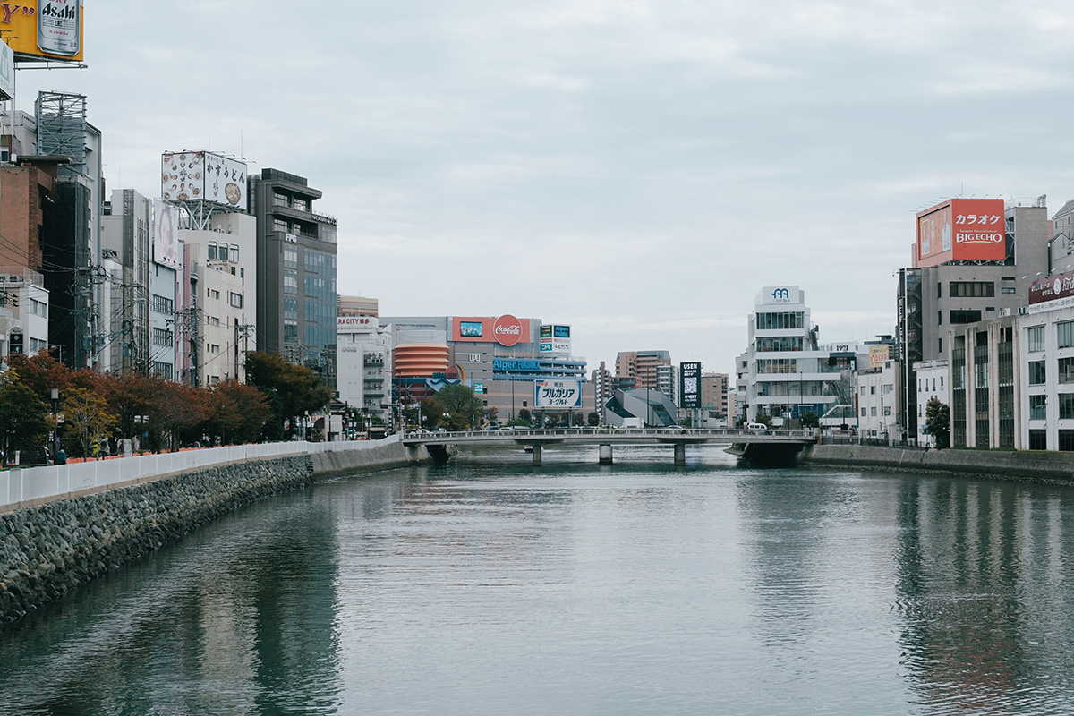 橋の向こうに見えるのはキャナルシティ。福岡で有名なショッピングスポットです。この辺りは夜になると川沿いにズラリと屋台が並びます。