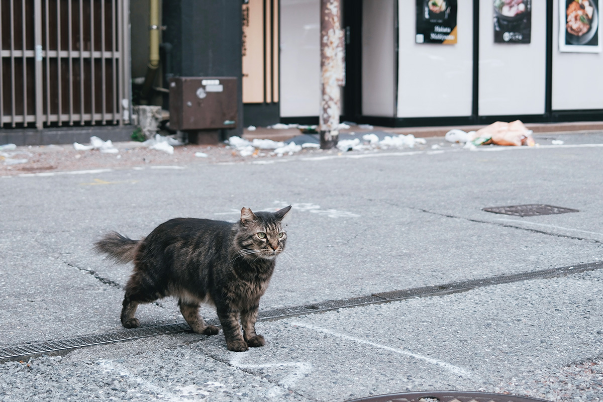 午前中のゴミが散乱した道をトコトコ歩く猫。猫が大好きなので、遭遇するとテンションが上がります。