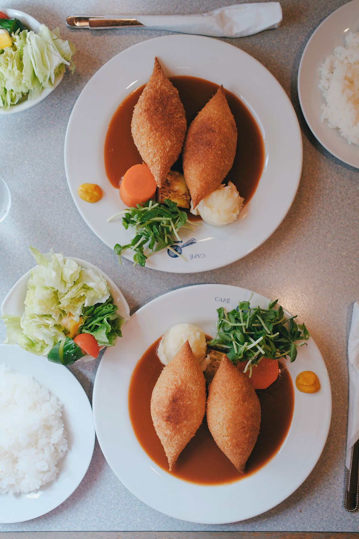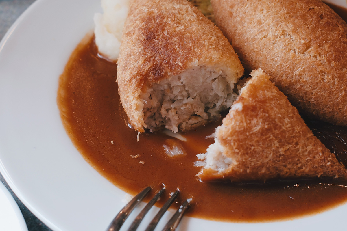 ここの名物ミンチカツレツはラグビーボールみたいな形。時々無性に食べたくなる美味しさです。