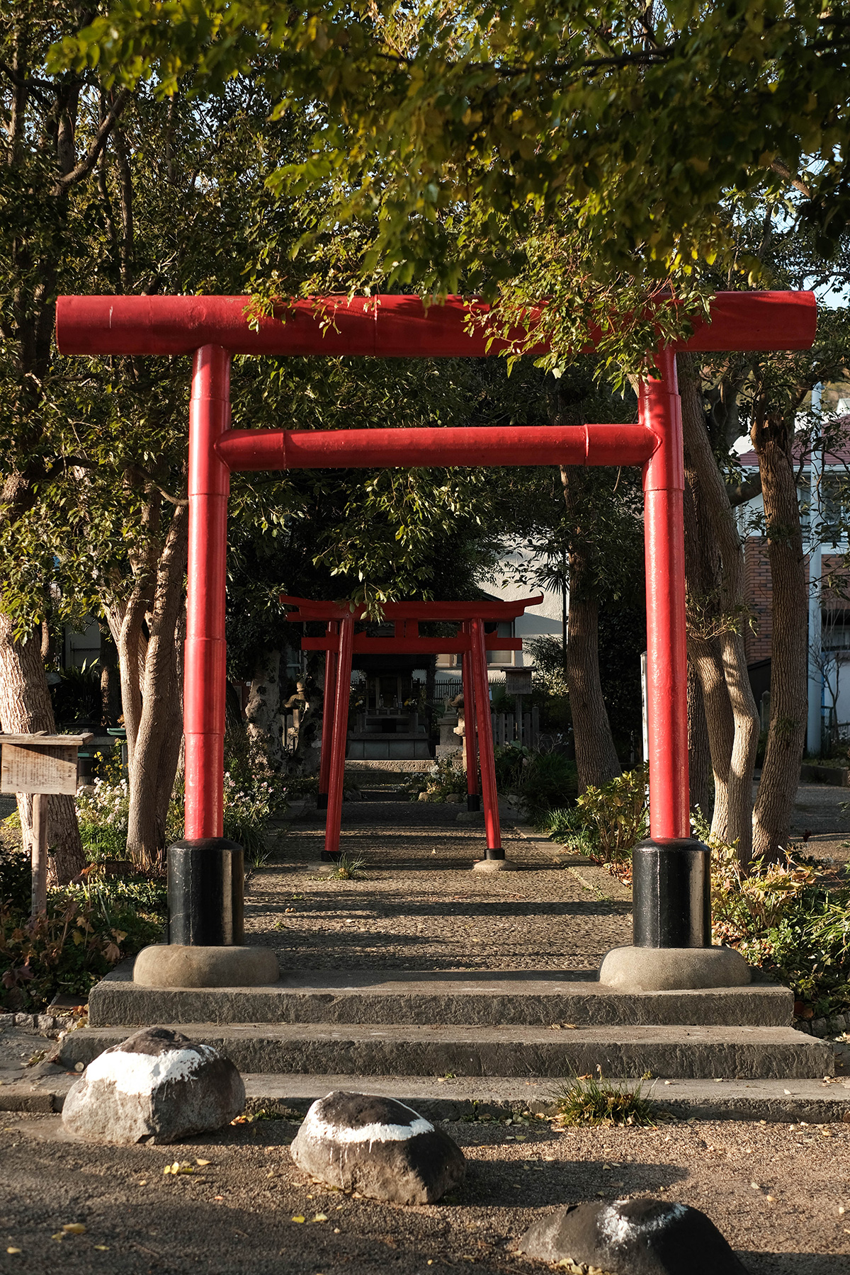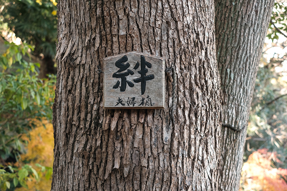 石段を一気に登ると、夫婦楠と、手仕事のぬくもりが滲む案内板に出会った。