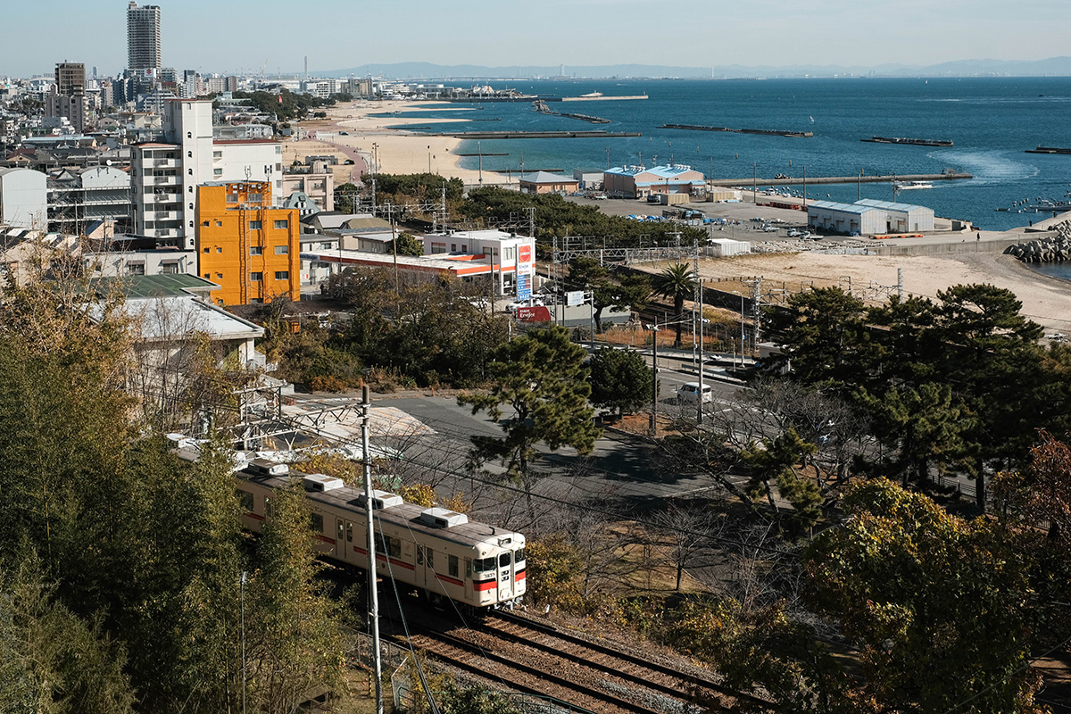 電車も海も砂浜も一枚に収めたくて、一の谷の路地を縫うように歩く。